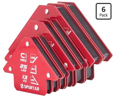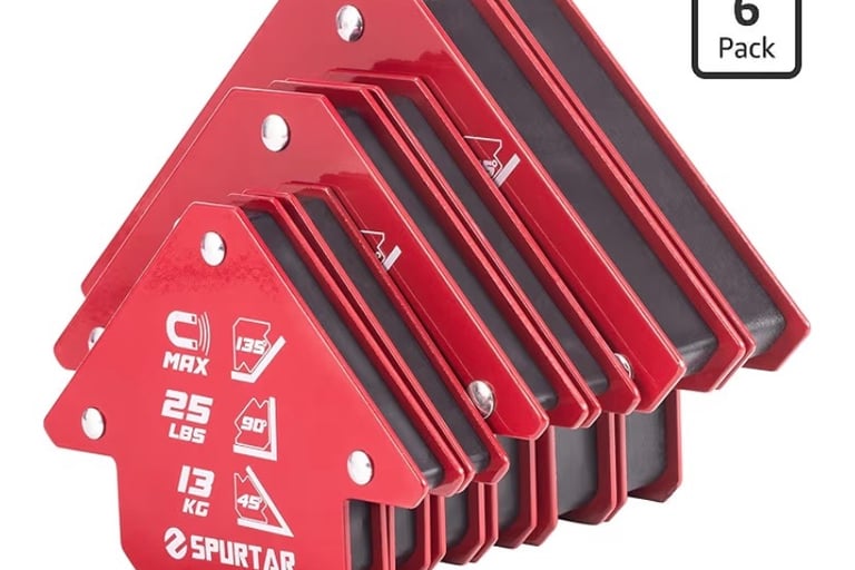 Magnetic welding holders like the Spurtar welding magnets can hold metal pieces at common angles such as 45°, 90°, and 135°. This allows you to tack weld pieces together without needing extra hands.